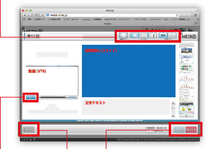 文字サイズが変更できます。 画面レイアウトが変更できます。 左:説明資料(スライド)中心 画面サイズを拡大することができます。 通常は拡大サイズでの視聴をお勧めします。 通常サイズに戻すには、もう一度「画面サイズ」をクリックしていただくか |